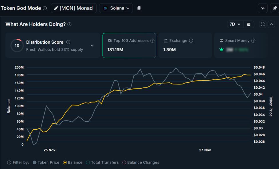 Các nhóm cá voi lớn nhất tăng tỷ lệ nắm giữ lên 10,67%, nâng tổng lượng MON họ sở hữu lên 176,44 triệu token.