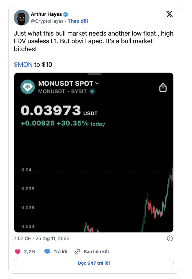 Ngày 25/11, Hayes châm biếm rằng thị trường tăng giá cần một “Layer-1 vô dụng nhưng vốn hóa tối đa thật lớn” rồi lại thừa nhận mình mua vào MON.