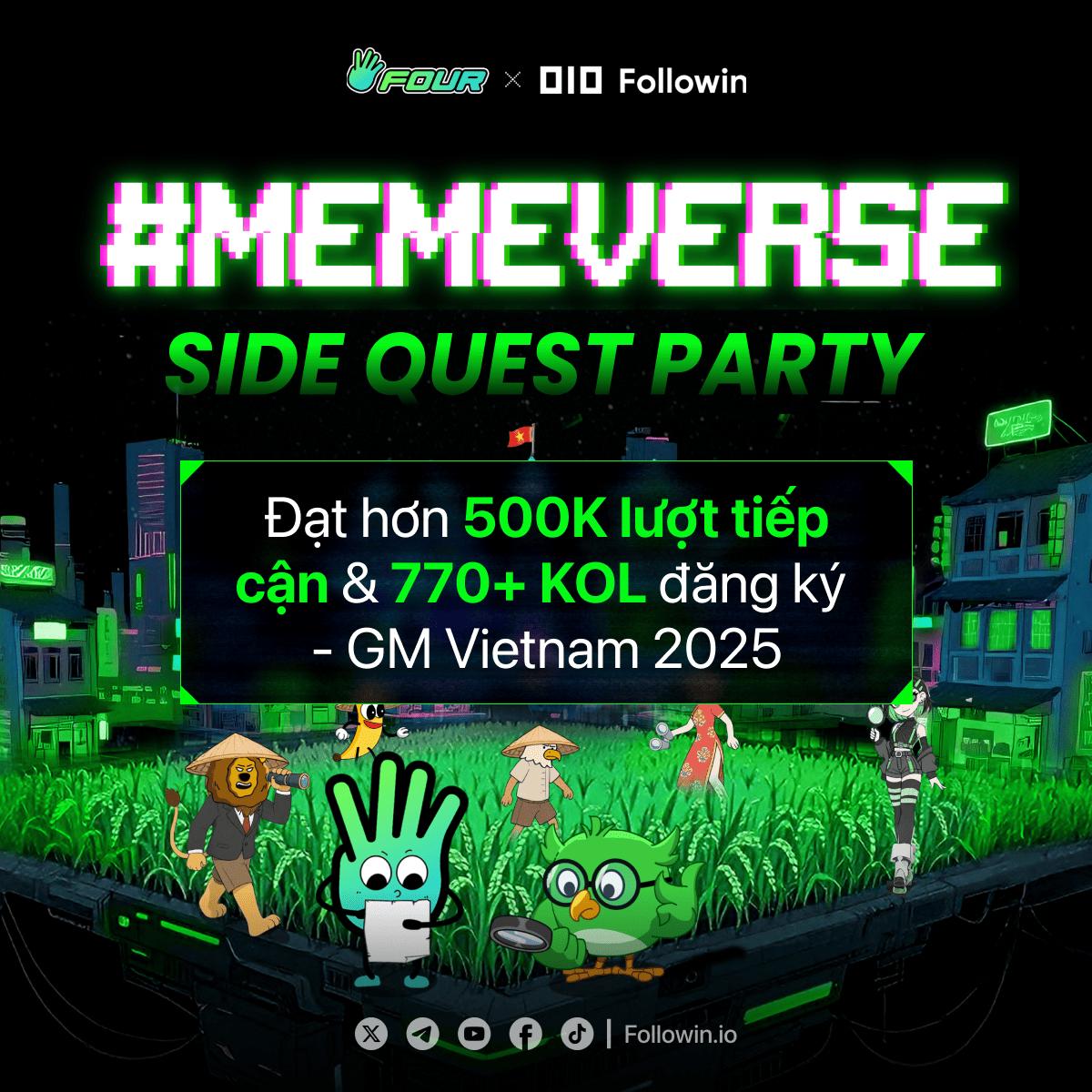 Memeverse: Side Quest Party là sự kiện giải trí – networking đặc biệt thuộc khuôn khổ GM Vietnam 2025, được Four.Meme và Followin đồng tổ chức. Không giống những buổi meetup Web3 thông thường, Memeverse Side Quest khoác lên mình tinh thần meme culture, hài hước, sáng tạo, đầy năng lượng, tạo nên một không gian vừa "alpha", vừa "full vibes" dành cho cộng đồng blockchain.