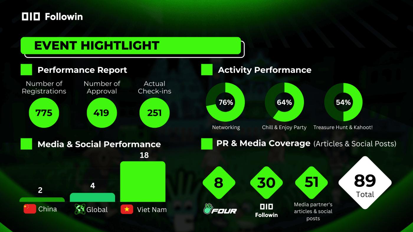 Sự kiện nhận được 89 bài truyền thông từ Followin, Four.Meme và hệ thống media partners bao gồm: 18 partner nội địa, 4 quốc tế, 2 Trung Quốc - góp phần đưa Memeverse lan tỏa ra ngoài phạm vi Việt Nam. Kết quả này cho thấy sức hút mạnh mẽ của mô hình sự kiện kết hợp meme culture, networking và chia sẻ các thông tin alpha.
