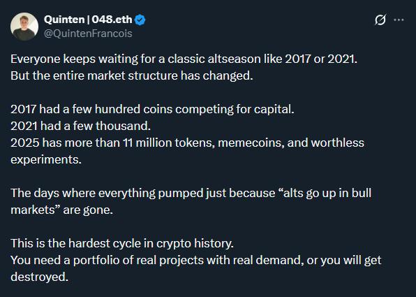 Quinten François cũng đồng tình, lưu ý rằng số lượng token trong năm 2025 đã vượt xa các chu kỳ trước. Với hơn 11 triệu token đang tồn tại, ý tưởng về một altseason diện rộng như 2017 hay 2021 có lẽ đã lỗi thời.