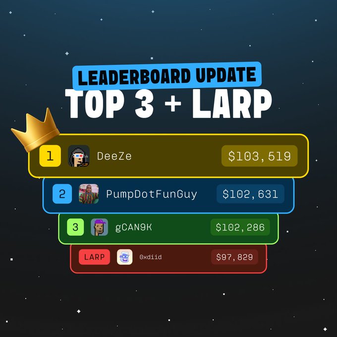 Kiểm tra bảng xếp hạng 👀 🥇 @DeeZe 🥈 @PumpDotFunGuy 🥉 @gCAN9k 🍅 @0xdiid Vẫn còn nhiều thời gian để giành vị trí đầu tiên.