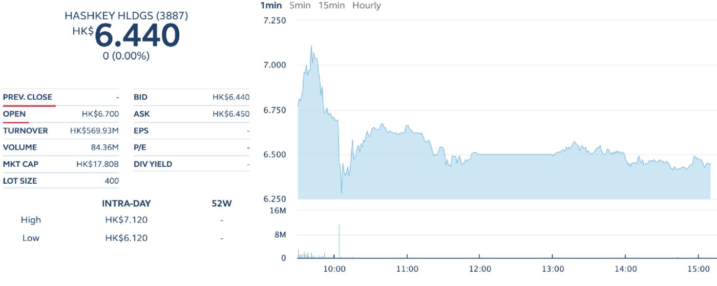 Trong phiên giao dịch đầu tiên, cổ phiếu HashKey biến động mạnh trong buổi sáng, có lúc tăng khoảng 5% so với giá mở cửa lên 7,1 HKD (0,91 USD), trước khi giảm xuống mức thấp nhất là 6,1 HKD (0,78 USD).