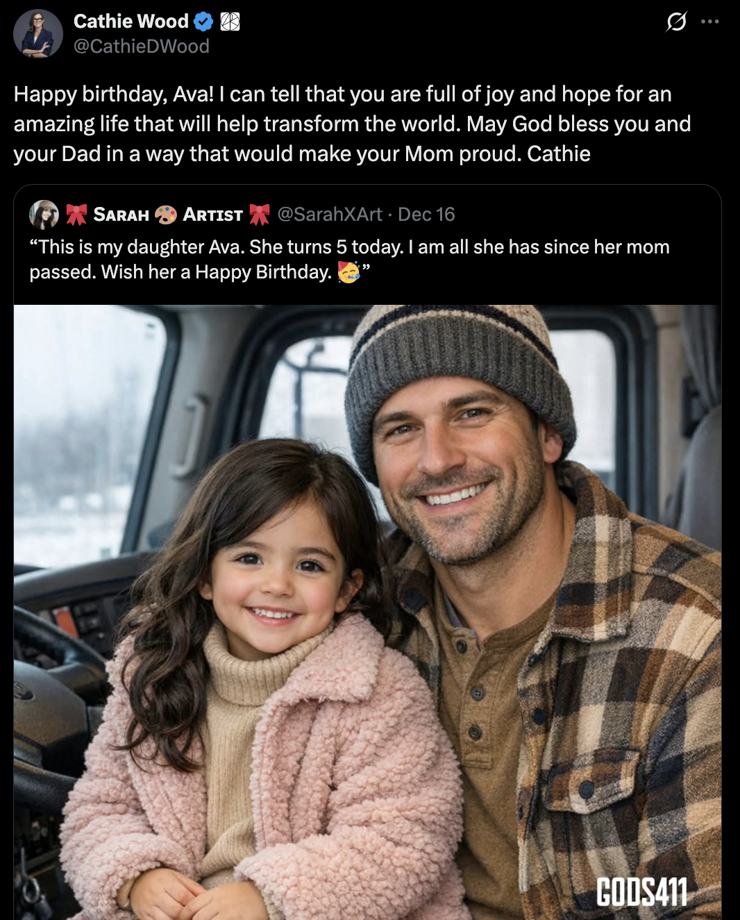 Cathie Wood, CEO của Ark Invest, người từng ca ngợi trí tuệ nhân tạo (AI) là “công nghệ mang tính đột phá nhất trong lịch sử” khi đầu tư hàng triệu đô la vào OpenAI của Sam Altman, dường như đã bị lừa trong tuần này khi chúc mừng sinh nhật một đứa trẻ do AI tạo ra.