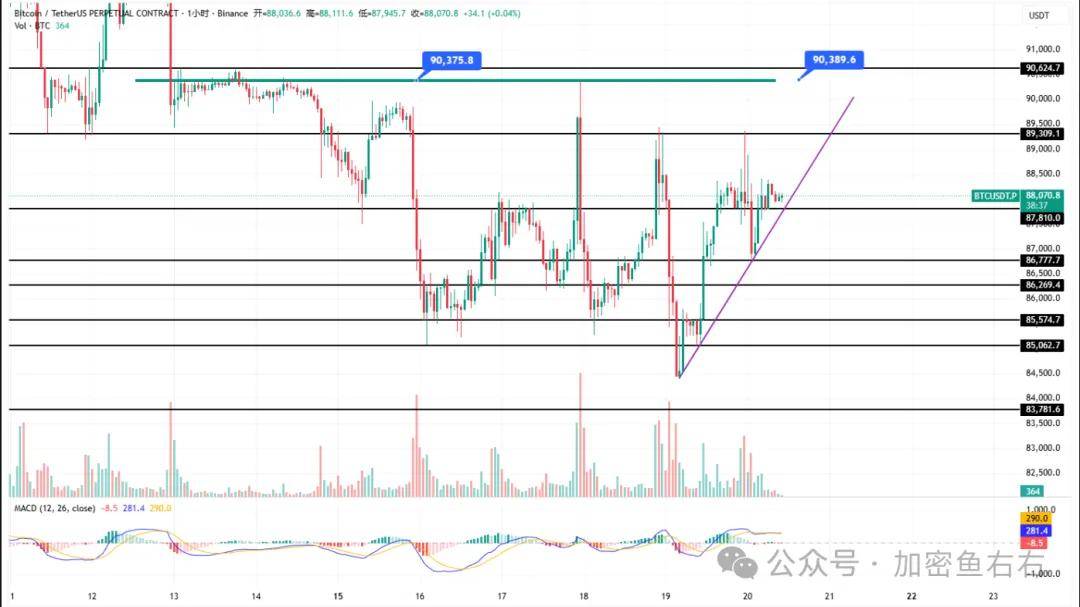 Sáng nay, BTC đã hình thành Nến xanh Doji tăng giá, cho thấy khả năng giao dịch đi ngang trong cuối tuần. Xu hướng tổng thể của BTC vẫn nằm trong cấu trúc tam giác tăng, hiện đang củng cố giữa dải trên và dải giữa quanh mức 89350 sau khi gặp kháng cự. Chỉ báo khung thời gian nhỏ hơn (dưới 1 giờ) đều nằm trên đường số 0, cho thấy biểu đồ giá đang mạnh lên một chút so với hai ngày trước đó.
