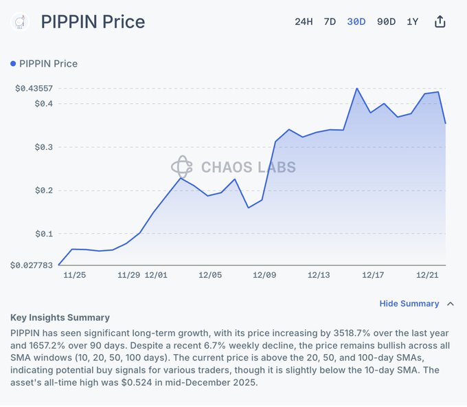 Loạt bài Edge: Thông tin thị trường #41 Các câu hỏi gợi ý từ @0xGeeGee | được hỗ trợ bởi Chaos AI 1. $PIPPIN Tăng 1.700% khi lượng nhà đầu tư lớn tích lũy gây ra tình trạng khan hiếm nguồn cung. Khoảng 5,5 triệu đô la token đã được các ví lớn hấp thụ, rút khoảng 44% nguồn cung lưu hành khỏi các sàn giao dịch và tạo ra tình trạng khan hiếm nguồn cung. Việc thanh lý các token trị giá trên 15 triệu đô la trong tháng 12 đã tạo ra xu hướng tăng giá tức thời, nhưng khối lượng giao dịch giao ngay giảm và hoạt động giao dịch sụt giảm cho thấy nhu cầu không tăng theo giá. Tình trạng tập trung sở hữu vẫn ở mức cực cao, với hơn 70% nguồn cung thuộc về một thực thể duy nhất và các đợt rút vốn trước đây vượt quá 90%. >> Đọc thêm về Trí tuệ nhân tạo hỗn loạn: ai.chaoslabs.xyz/chat/pippin-p...…