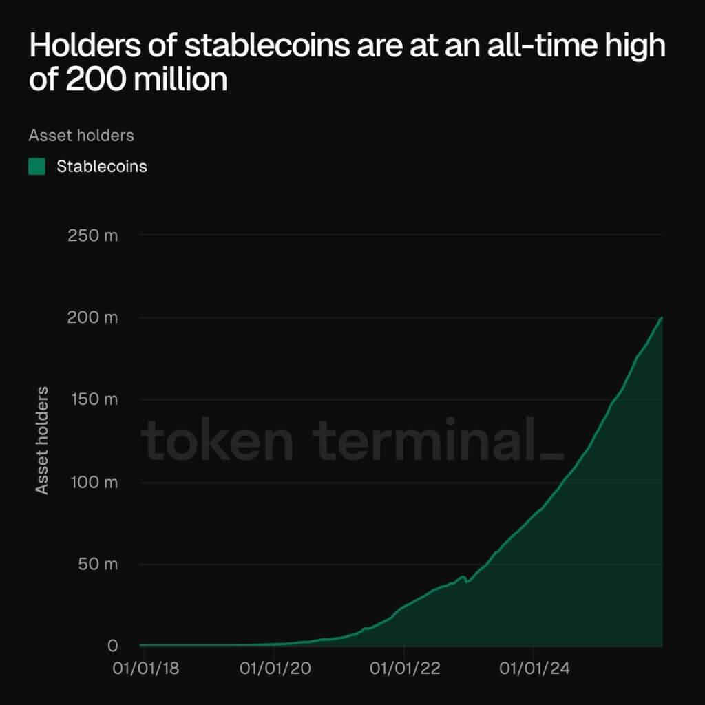 Thực tế, dữ liệu từ Token Terminal cho thấy tổng số người nắm giữ stablecoin đã đạt mức cao lịch sử , khoảng 200 triệu người.