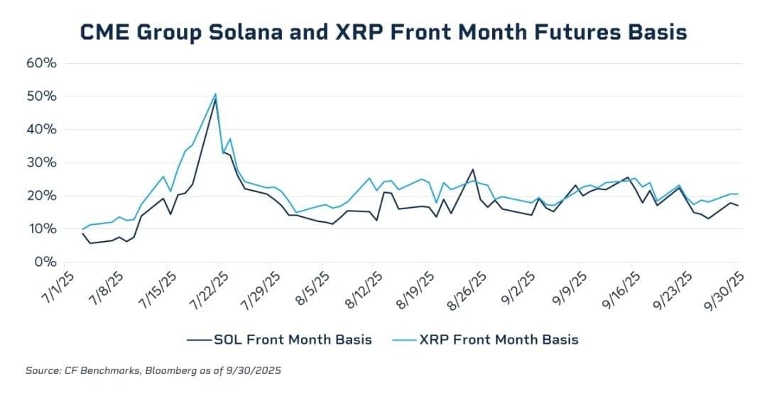 Trong một thời gian dài, CME là thị trường độc quyền kép do BTC và ETH thống trị. Tuy nhiên, mô hình này đã bị phá vỡ vào năm 2025. Với sự ra mắt của hợp đồng tương lai và quyền chọn SOL và XRP, CME chính thức bước vào kỷ nguyên tài sản. SOL, một ứng cử viên mạnh mẽ cho vị trí tài sản lớn thứ ba, đã chứng kiến hiệu suất ấn tượng của hợp đồng tương lai kể từ khi ra mắt vào tháng 3. Tính đến quý 3, khối lượng giao dịch tích lũy đạt 730.000 hợp đồng, với giá trị danh nghĩa là 34 tỷ đô la. Quan trọng hơn, khối lượng hợp đồng mở (OI) của hợp đồng tương lai SOL đã nhanh chóng vượt qua 2,1 tỷ đô la vào tháng 9, lập kỷ lục về tốc độ tăng gấp đôi nhanh nhất khối lượng mở mới. Trong khi đó, hợp đồng tương lai XRP đã giao dịch 476.000 hợp đồng kể từ khi ra mắt vào tháng 5. Quyền chọn XRP được ra mắt vào ngày 13 tháng 10 đã trở thành sản phẩm đầu tiên được CFTC quản lý. Điều này cho thấy các nhà đầu tư tổ chức không còn đánh đồng crypto với BTC nữa. Đối với tài sản như SOL và XRP với đặc điểm rủi ro - lợi nhuận khác nhau, các tổ chức đang bắt đầu tìm kiếm các kênh phòng hộ tuân thủ quy định, cho thấy Quỹ phòng hộ crypto đa chiến lược sẽ hoạt động tích cực hơn trên CME trong tương lai.