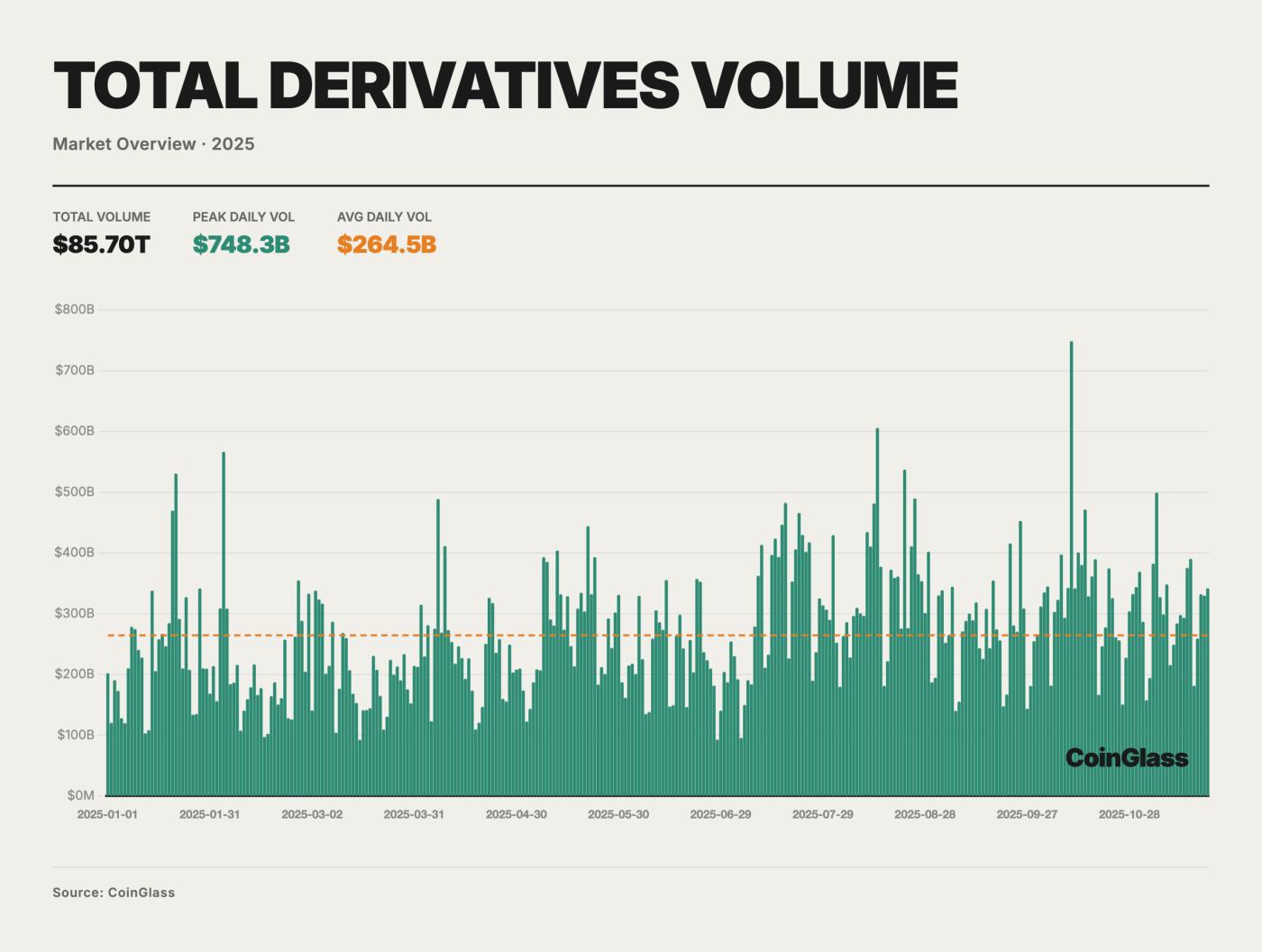 Năm 2025, tổng khối lượng giao dịch của thị trường phái sinh crypto đạt khoảng 85,70 nghìn tỷ đô la, với khối lượng giao dịch trung bình hàng ngày khoảng 264,5 tỷ đô la. Trong bối cảnh hoàn cảnh thanh khoản kinh tế vĩ mô vẫn còn eo hẹp và sự phục hồi dần dần về khẩu vị rủi ro , hoạt động giao dịch tổng thể trong suốt năm cho thấy cấu trúc "ban đầu thấp, sau đó cao, với sự biến động mạnh theo chiều hướng tăng". Hiện nay, phái sinh đã trở thành kênh chính để hình thành giá cả và quản lý rủi ro cho hầu hết tài sản chính thống. Biểu đồ cho thấy nhiều ngày có khối lượng giao dịch cao vượt quá giá trị trung bình được biểu thị bằng đường chấm màu cam, trong đó mức đỉnh trong một ngày đạt khoảng 748 tỷ đô la vào ngày 10 tháng 10, cao hơn đáng kể so với mức bình thường trong năm. Điều này phản ánh rằng trong các giai đoạn thị trường biến động nhanh, phái sinh đã trở thành chiến trường cốt lõi để hình thành giá và giao dịch đòn bẩy. Nhìn vào số liệu hàng tháng, khối lượng giao dịch trung bình hàng ngày trong quý đầu tiên chủ yếu ở mức khoảng 200 tỷ đô la, tăng dần từ quý thứ hai trở đi, với mức trung bình hàng ngày vượt quá 300 tỷ đô la vào tháng 7-8 và tháng 10.