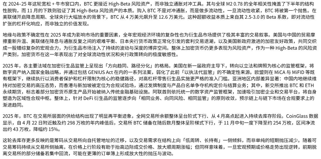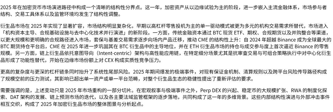Chủ đề chính của thị trường phái sinh crypto năm 2025 là sự chuyển dịch từ đầu cơ bán lẻ với thanh khoản cao sang định giá lại, được thúc đẩy bởi sự phát triển song song của vốn đầu tư tổ chức, cơ sở hạ tầng tuân thủ quy định và công nghệ trên Chuỗi . Thanh khoản vĩ mô sẽ quyết định xu hướng, với crypto trải qua sự biến động mạnh do hệ số beta cao trong bối cảnh kỳ vọng về việc cắt giảm lãi suất và sự thay đổi trong khẩu vị rủi ro. Các yếu tố và chính sách địa chính trị sẽ là những tác nhân kích hoạt. Trong giai đoạn giảm đòn bẩy suốt cả năm, cú sốc ngoại sinh vào tháng 10, cùng với đòn bẩy quá tải trong quý 3, đã khiến tổng khối lượng giao dịch mở (OI) giảm hơn 70 tỷ đô la so với mức đỉnh điểm trong hai ngày, dẫn đến mức thanh lý đỉnh điểm lên tới hàng chục tỷ đô la.