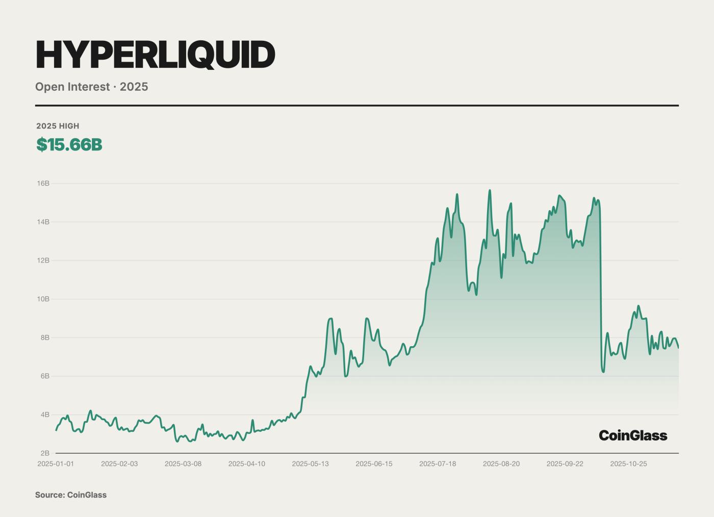 Hyperliquid không chỉ thu hút khối lượng giao dịch khổng lồ mà còn tích lũy một lượng lớn hợp đồng mở. Dữ liệu từ tháng 10 năm 2025 cho thấy hợp đồng mở trên nền tảng này đạt 15 tỷ đô la, chiếm khoảng 63% tổng vị thế giữ trên các nền tảng hợp đồng vĩnh cửu phi tập trung lớn. Chỉ báo này cho thấy lượng lớn đang lựa chọn duy trì vị thế dài hạn trên Hyperliquid, phản ánh mức độ tin tưởng cao của các nhà giao dịch vào thanh khoản và sự ổn định của nền tảng.