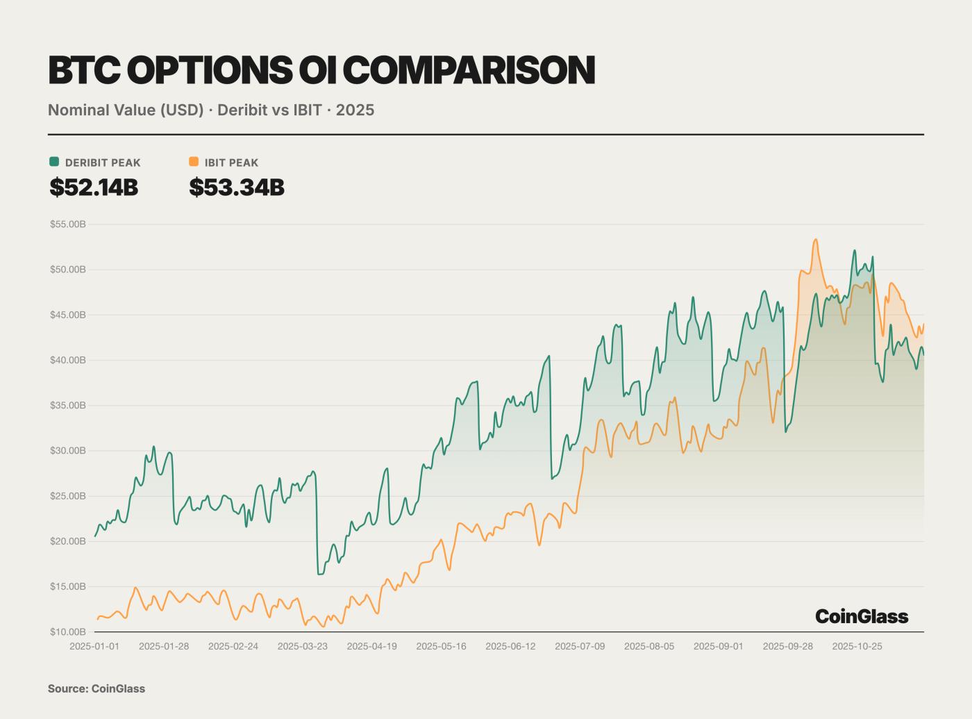 Các quyền chọn ETF IBIT của BlackRock đã nổi lên mạnh mẽ, tạo ra thách thức trực tiếp đối với Deribit . Là một ETF BTC giao spot được niêm yết trên Nasdaq, các quyền chọn của IBIT đã chứng kiến sự tăng vọt đáng kể về khối lượng giao dịch mở chỉ chưa đầy một năm sau khi ra mắt vào cuối năm 2024. Đến tháng 11 năm 2025, IBIT đã trở thành nền tảng giao dịch quyền chọn BTC lớn nhất thế giới, soán ngôi Deribit , vị địa vị dẫn đầu trong nhiều năm. Thành công của các quyền chọn IBIT cho thấy tầm ảnh hưởng đáng kể của các lực lượng tài chính truyền thống – một lượng lớn các nhà đầu tư tổ chức trước đây bị hạn chế tham gia vào các nền tảng nước ngoài do các quy định đã tham gia vào thị trường quyền chọn BTC thông qua IBIT, mang lại lượng vốn và nhu cầu khổng lồ. Uy tín và khuôn khổ tuân thủ của các công ty quản lý tài sản lớn như BlackRock đứng sau IBIT cũng đã thu hút các tổ chức thận trọng hơn sử dụng quyền chọn để quản lý rủi ro BTC. Tính đến tháng 11 năm 2025, IBIT, với tư cách là ETF BTC spot lớn nhất, đã quản lý 84 tỷ đô la, cung cấp hỗ trợ spot và thanh khoản cho thị trường quyền chọn, chứng minh đầy đủ nhu cầu thị trường mạnh mẽ đối với các quyền chọn ETF spot.