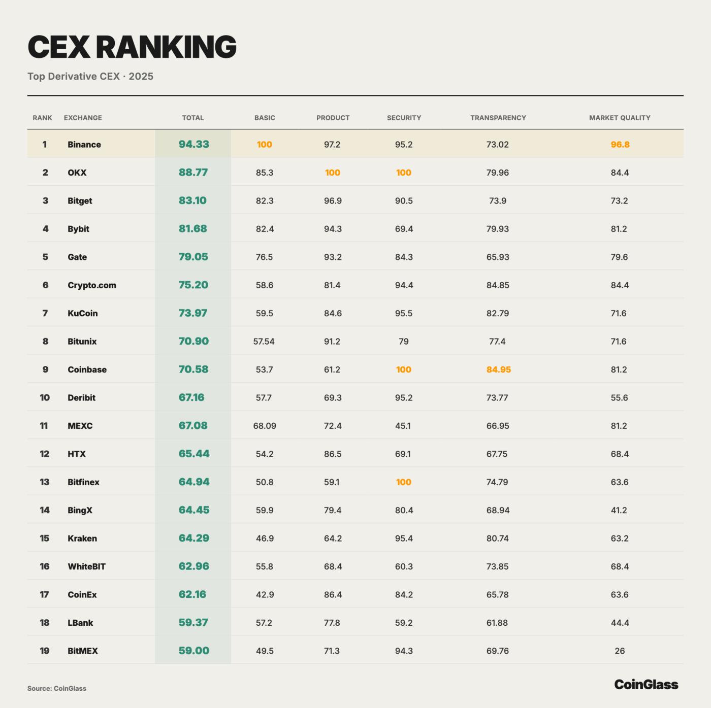 Để vượt ra khỏi lối kể chuyện chỉ tập trung vào khối lượng giao dịch và hướng tới chất lượng tương đương giữa các nền tảng giao dịch phái sinh hàng đầu trong lĩnh vực CEX, coinglass đã tiến hành chấm điểm và sắp xếp toàn diện các CEX phái phái sinh lớn. Biểu đồ bên dưới sử dụng dữ liệu giao dịch cơ bản làm tỷ trọng và cung cấp điểm số phụ cũng như tổng điểm có trọng số trên các khía cạnh như sản phẩm, bảo mật, tính minh bạch và chất lượng thị trường. Điều này thể hiện trực quan sự khác biệt về cấu trúc giữa các nền tảng về khả năng thanh khoản, các hạn chế kiểm soát rủi ro và việc công khai thông tin.
