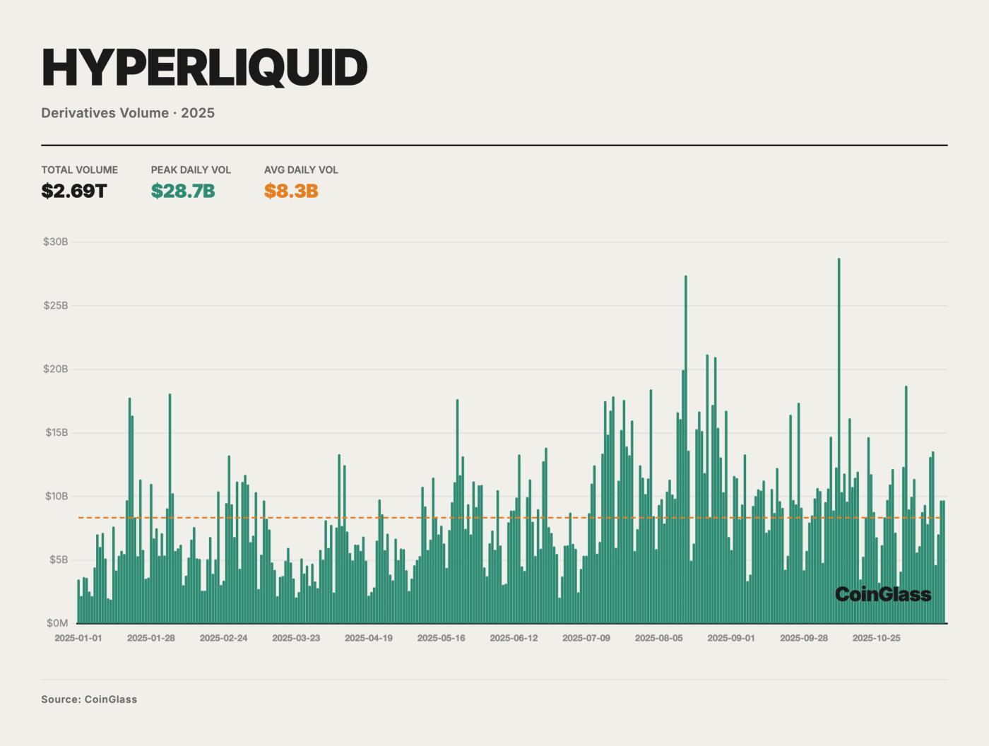 Năm 2025 là một năm đặc biệt thành công đối với PerpDEX. Hoạt động giao dịch trên thị trường tăng trưởng, liên tục phá vỡ lịch sử . Khối lượng giao dịch hàng tháng lần đầu tiên vượt quá 1,2 nghìn tỷ đô la vào tháng 10, và tổng khối lượng giao dịch phái sinh Chuỗi trong năm đạt đến hàng nghìn tỷ đô la. Sự tăng vọt về khối lượng giao dịch và chiếm tỷ lệ ngày càng tăng này được thúc đẩy bởi sự kết hợp của nhiều yếu tố, bao gồm những đột phá về hiệu năng, nhu cầu người dùng tăng và những thay đổi trong hoàn cảnh pháp lý. Các nhà đầu tư nhà đầu tư bán lẻ, các bộ phận giao dịch tổ chức và các quỹ đầu tư rủi ro đều đổ dồn sự chú ý vào lĩnh vực đang bùng nổ này trong năm 2025.