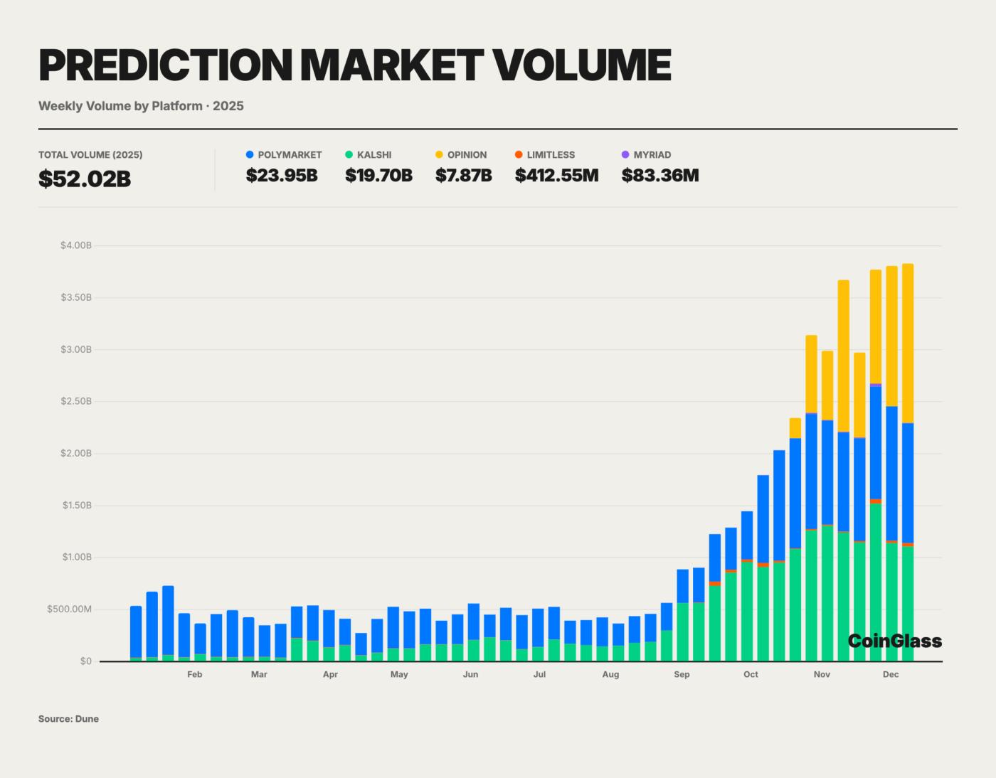 Thị trường dự đoán crypto đã trải qua tăng trưởng bùng nổ vào năm 2025, với tổng khối lượng giao dịch đạt khoảng 52 tỷ đô la từ tháng 1 đến tháng 11, vượt qua mức đỉnh điểm trong cuộc bầu cử tổng thống Mỹ năm 2024.