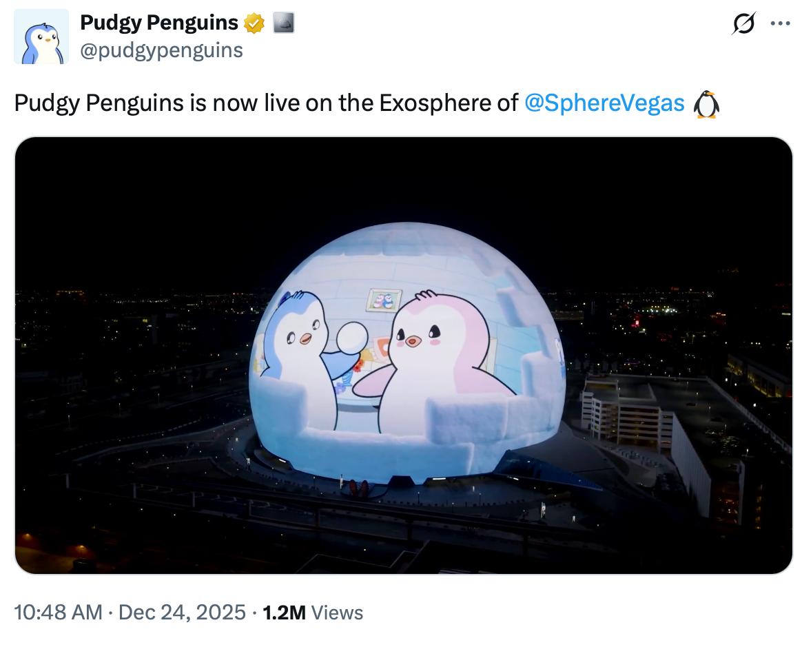 Trong một bài đăng trên X, Pudgy Penguins cho biết các hoạt ảnh của họ đã được phát sóng từ đêm Giáng sinh trên mặt ngoài của Las Vegas Sphere - một công trình mái vòm nổi tiếng được bao phủ bởi các tấm LED độ phân giải cao, có thể hiển thị hình ảnh quy mô lớn và nhìn thấy dọc theo Las Vegas Strip.