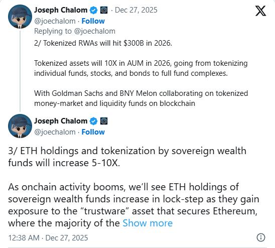 Dù vậy, Chalom tập trung vào nhu cầu mang tính cấu trúc thay vì biến động giá ngắn hạn. Ông kỳ vọng các quỹ tài sản quốc gia sẽ gia tăng mức nắm giữ Ethereum và mức độ tiếp xúc với token hóa lên gấp 5–10 lần trong năm tới, khi áp lực cạnh tranh giữa các nhà phân bổ vốn lớn gia tăng. Theo ông, việc đứng ngoài từng là lựa chọn an toàn nhất, nhưng điều này đang dần thay đổi.