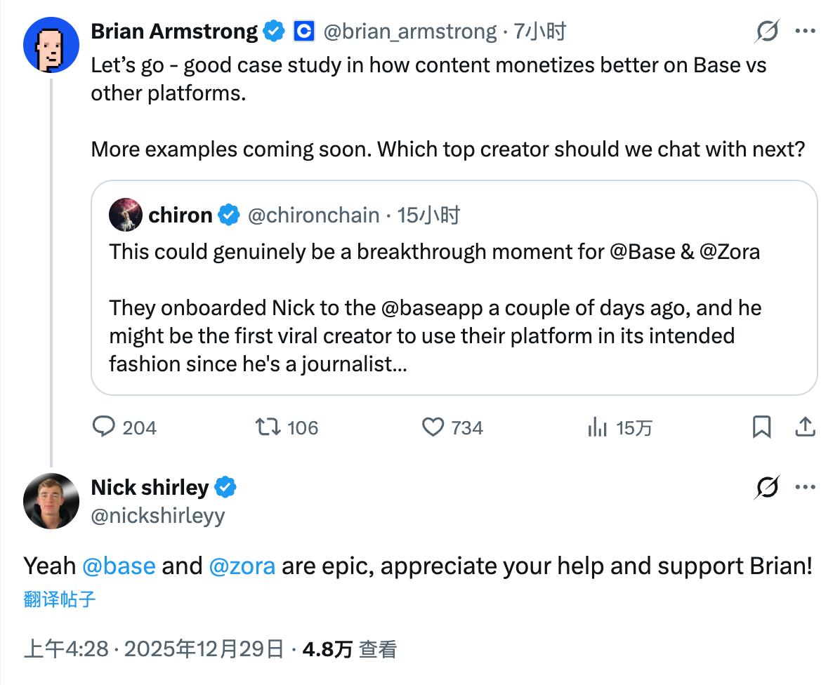 Brian Armstrong khẳng định điều này chứng tỏ việc kiếm tiền từ nội dung trên Base hiệu quả hơn so với các nền tảng khác, và Nick Shirley cũng cảm ơn Brian Armstrong sau khi kiếm được tiền, đồng thời ca ngợi Base và Zora là "huyền thoại".