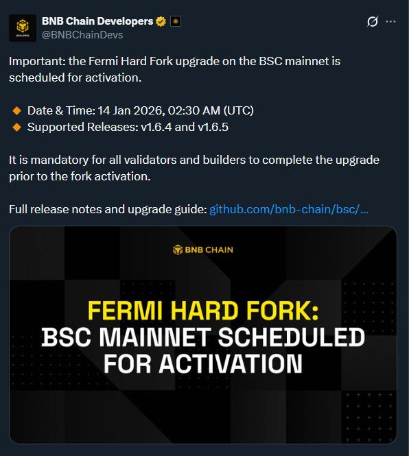 Ngày 14/1 được xem là chất xúc tác lớn tiếp theo cho BNB, khi việc ra mắt mainnet hard fork Fermi có thể giúp xoa dịu các dự báo giá BNB đang thiên về tiêu cực.