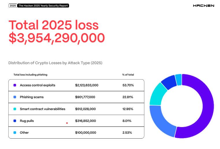 Theo Hacken, các thất bại trong kiểm soát truy cập và sự sụp đổ an ninh vận hành rộng hơn chiếm khoảng 2,12 tỷ USD, tương đương gần 54% tổng tổn thất năm 2025, so với khoảng 512 triệu USD đến từ các lỗ hổng hợp đồng thông minh.