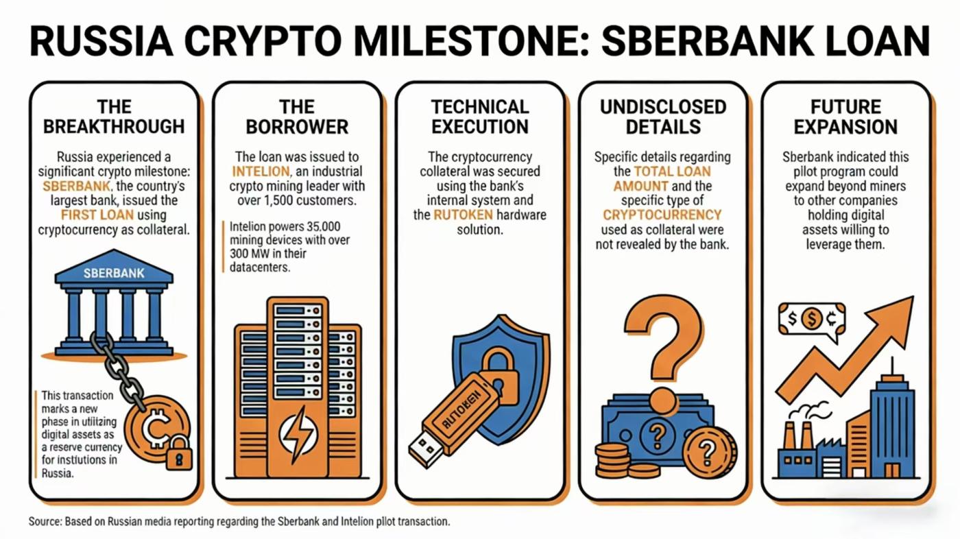 Vào ngày 28 tháng 12 năm 2025, ngân hàng lớn nhất của Nga, Sberbank, đã cấp khoản vay thí điểm cho công ty Đào coin Bitcoin Intelion Data bằng cách sử dụng tài sản tiền điện tử được tạo ra một cách năng động làm tài sản thế chấp, đánh dấu thực tiễn tín dụng tài sản on-chain đầu tiên trong hệ thống ngân hàng truyền thống của Nga.