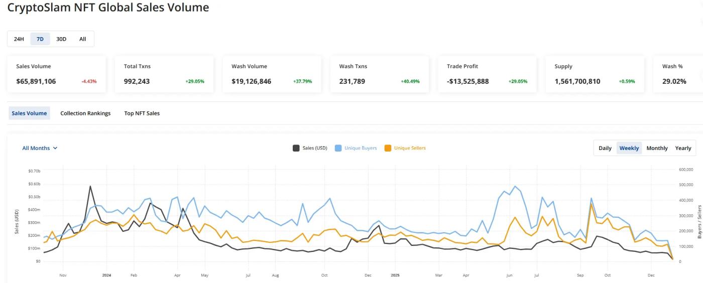 Sự sụp đổ của thị trường NFT thậm chí còn đáng báo động hơn. Dữ liệu cho thấy thị trường NFT đã chạm đáy trong năm vào tháng 12 , với tổng giá trị giảm mạnh từ 9,2 tỷ đô la vào tháng 1 xuống còn 2,5 tỷ đô la, giảm 72% . Đồng thời, hoạt động thị trường thu hẹp đáng kể; theo dữ liệucủa CryptoSlam , số lượng người bán đã giảm xuống dưới 100.000 lần đầu tiên kể từ tháng 4 năm 2021 .