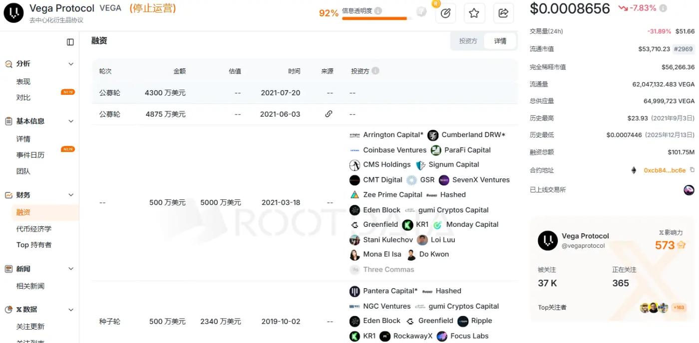 Trong số các dự án thất bại được công khai, Vega Protocol, dự án đã huy động được một lượng vốn đáng kể, thu hút hơn 100 triệu đô la đầu tư từ 29 nhà đầu tư hàng đầu, bao gồm Coinbase Ventures và Ripple , dựa trên viễn cảnh mong đợi về phái sinh phái sinh phi tập trung . Tuy nhiên, tổng giá trị bị khóa (TVL) mainnet của nó vẫn trì trệ ở mức hàng trăm nghìn đô la trong một thời gian dài, thấp hơn nhiều so với các đối thủ cạnh tranh như Hyperliquid . Cuối cùng, do cả tăng trưởng người dùng chậm chạp và nguồn lực cạn kiệt, dự án đã đóng cửa mainnetLayer 1 thông qua bỏ phiếu của cộng đồng và chuyển trọng tâm sang phát triển phần mềm.