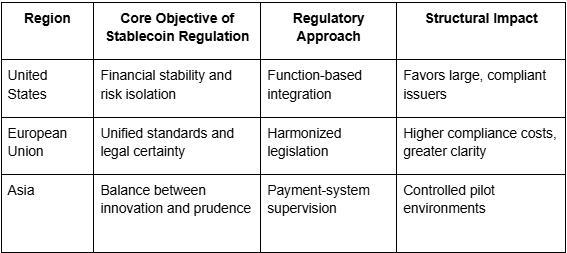 Các phương pháp quản lý stablecoin khác nhau giữa các khu vực pháp lý chính.