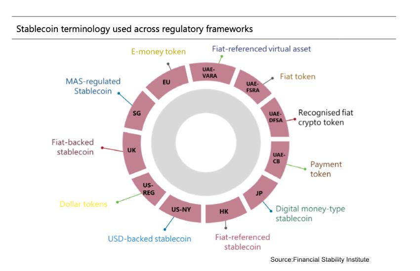 Hình 1: Sự khác biệt về thuật ngữ quy định và phân loại pháp lý của stablecoin giữa các khu vực pháp lý