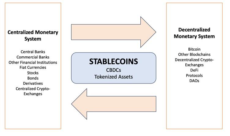 Hình 2: Vai trò cầu nối của stablecoin giữa hệ thống tài chính tập trung và phi tập trung.
