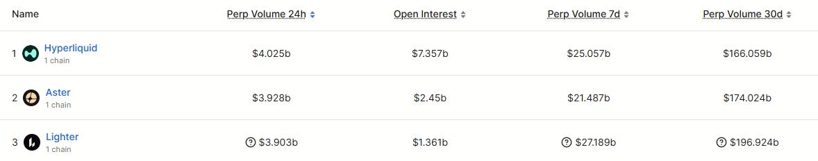 Thứ hai, dù mới ra mắt nhưng Lighter đã đạt khối lượng giao dịch 24 giờ ngang ngửa với Aster và rất sát Hyperliquid. Khối lượng 7 ngày và 30 ngày của Lighter thậm chí còn cao hơn cả hai đối thủ này.