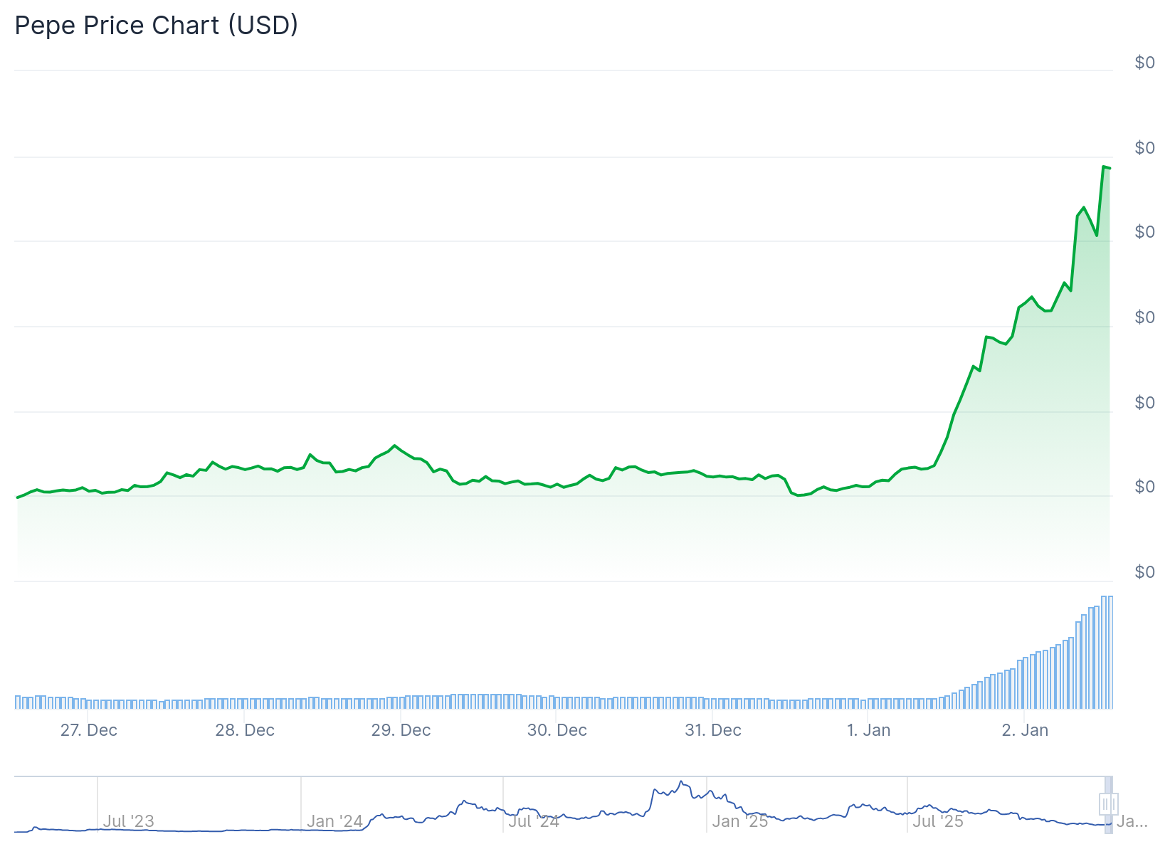 Các memecoin vốn hóa lớn đang dẫn đầu đợt tăng giá tiền điện tử đầu năm mới, với PEPE (PEPE) đạt mức tăng mạnh nhất trong số 100 token hàng đầu vào thứ Sáu, ngày 2 tháng 1.