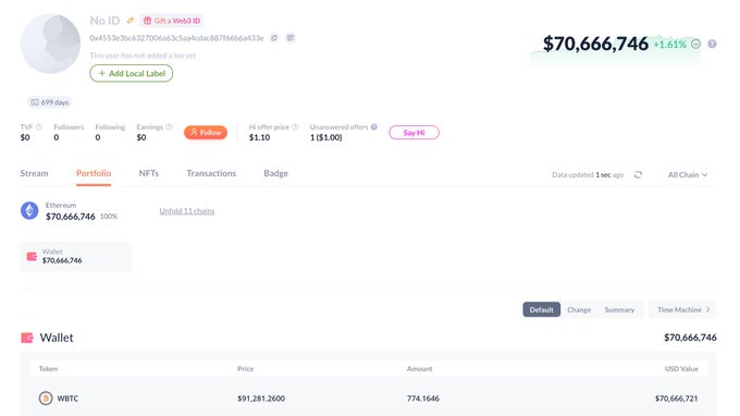 Hiện tại, ông đã chuyển đổi phần lớn số ETH nắm giữ của mình thành WBTC: tổng cộng 21.973 ETH (68,9 triệu đô la) đã được đổi lấy 761,4 WBTC, với giá trung bình là 90.491 đô la cho mỗi WBTC.