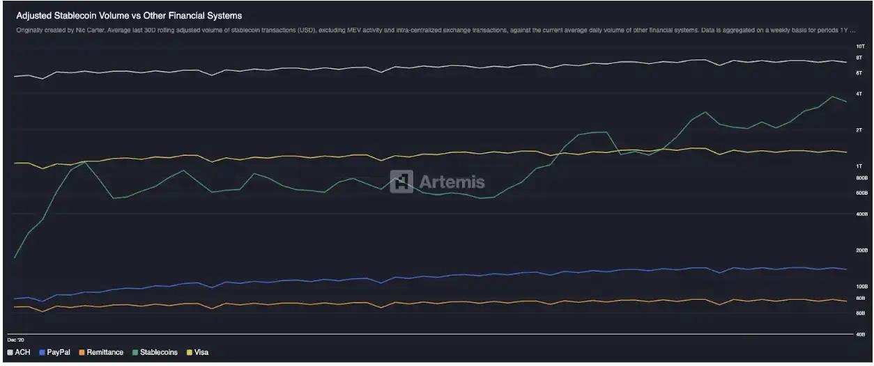 Sự chuyển đổi này đã thể hiện rõ ràng trong các ứng dụng quy mô lớn. Giá trị vốn hóa thị trường của stablecoin đã tăng từ gần bằng không lên khoảng 300 tỷ đô la trong chưa đầy một thập kỷ, và ngay cả khi không tính đến các giao dịch chuyển khoản giữa nền tảng giao dịch và giá trị rút tối đa (MEV), khối lượng giao dịch kinh tế thực tế mà chúng xử lý đã vượt qua các mạng thanh toán truyền thống như PayPal và Visa. Lần đầu tiên, một tình huống đã xuất hiện, trong đó các mạng thanh toán phi ngân hàng, phi thẻ có thể thực sự đạt được hoạt động trên quy mô toàn cầu.
