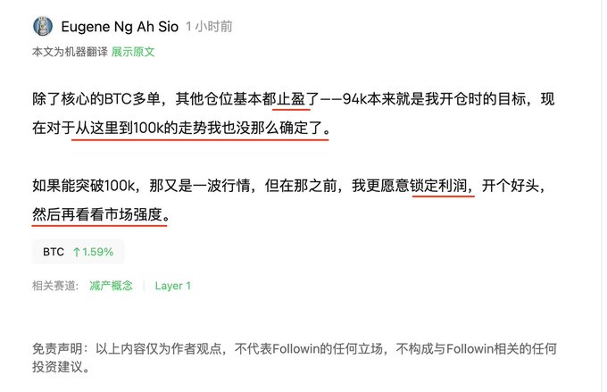 他此前精准预测 #BTC 冲上9.4万美元目标位,现在已基本落袋为安。