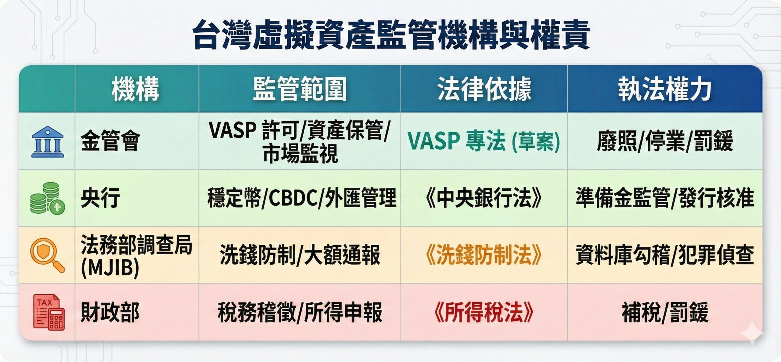VASP 專法建立了多部會協作的監管體系,各機構依據不同法律依據執行監管職責: