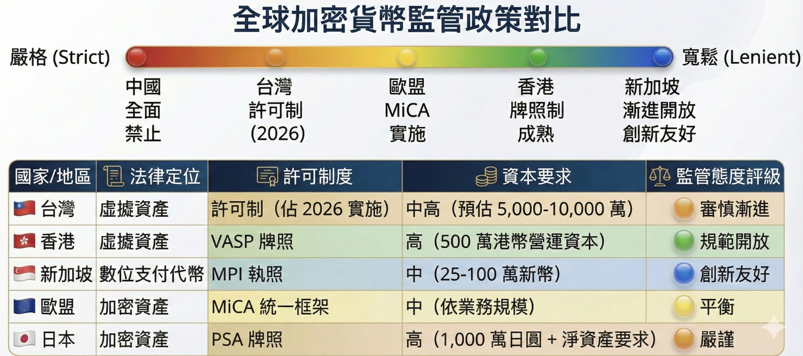 將台灣 VASP 專法放在全球監管光譜中觀察,可以發現台灣採取「審慎漸進」路線,位於嚴格與寬鬆之間: