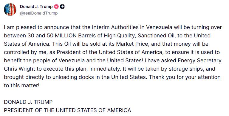 Tổng thống Donald Trump hôm thứ Ba tuyên bố rằng "chính quyền lâm thời" của Venezuela sẽ chuyển giao từ 30 đến 50 triệu thùng dầu cho Hoa Kỳ, vài ngày sau khi lực lượng Mỹ bắt giữ Nicolás Maduro trong một cuộc đột kích quân sự.