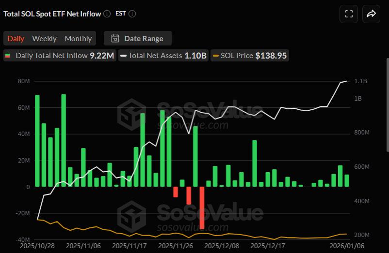 Số liệu thống kê từ thị trường ETF spot Solana cho thấy dòng vốn ròng hàng ngày đạt 9,22 triệu đô la.
