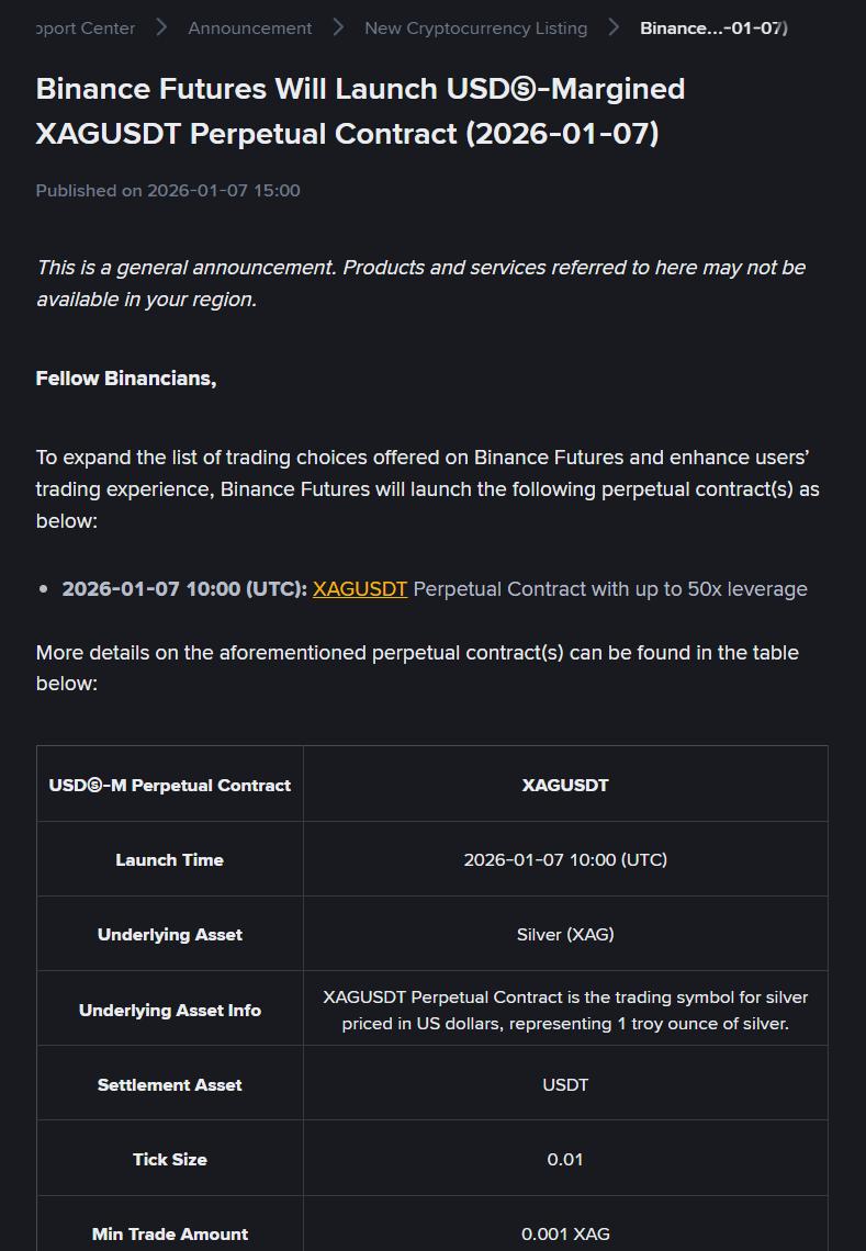 Theo một báo cáo chính thức TechFlow vào ngày 7 tháng 1, Binance ra mắt hợp đồng vĩnh cửu XAGUSDT (Bạc) vào lúc 10:00 (UTC) ngày 7 tháng 1 năm 2026. Các hợp đồng này sẽ hỗ trợ đòn bẩy lên đến 50x và sẽ mở dịch vụ sao chép lệnh hợp đồng trong vòng 24 giờ ra mắt .