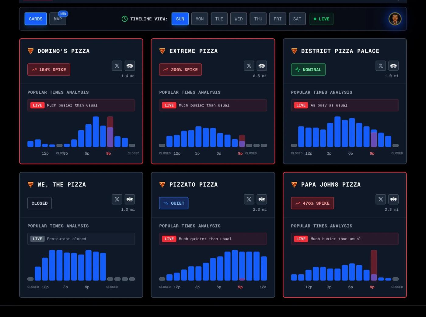 Dữ liệu mới được công bố tối Chủ nhật cho thấy hoạt động tại cửa hàng Papa John's Pizza, nằm cách Lầu Năm Góc 2,3 dặm, đã tăng vọt 476%, trong khi hoạt động tại cửa hàng Extreme Pizza gần hơn nữa tăng 200%. Mức tăng 1250% từ điểm thấp nhất đến điểm cao nhất đại diện cho Cao nhất mọi thời đại (ATH).