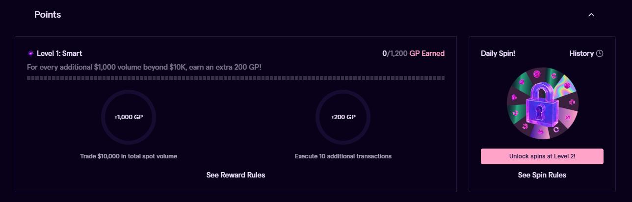 BƯỚC 3. Bên dưới mục “Airdrop”, phần đầu tiên là “Điểm”. Tích lũy được 10.000 đô la khối lượng giao dịch sẽ nhận được 1200 điểm GP. Sau khi vượt quá 10.000 đô la, bạn sẽ nhận được 200 điểm GP cho mỗi 1.000 đô la khối lượng giao dịch tăng thêm. Ngoài ra, bạn nhận được một lượt quay miễn phí trên vòng quay may mắn cho mỗi giao dịch hàng ngày trên nền tảng và thêm một lượt quay cho mỗi 10.000 đô la khối lượng giao dịch, không giới hạn mức tối đa.