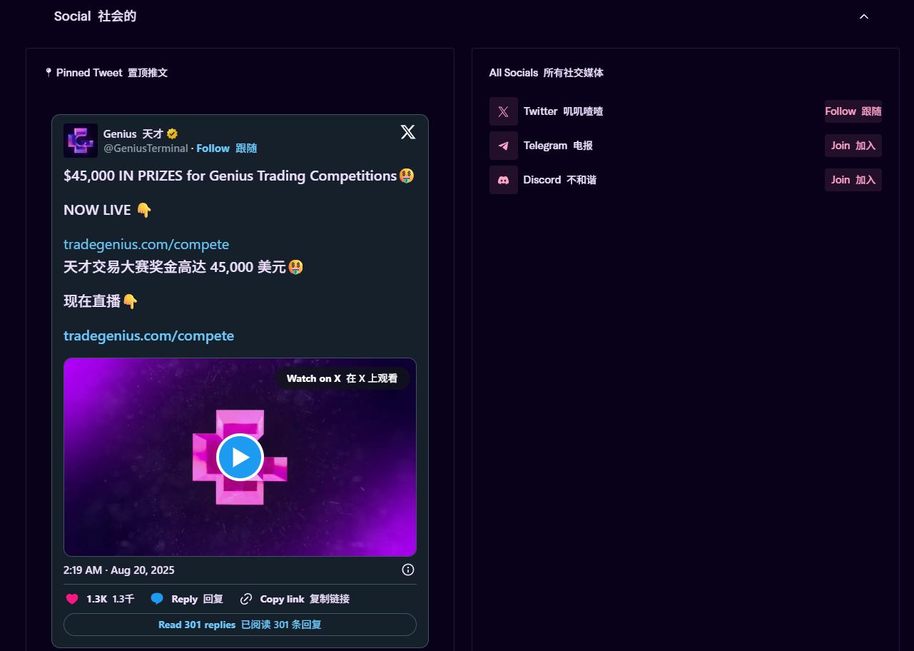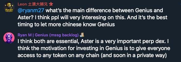 Ngoài ra, Giám đốc Marketing của Genius, Ryan, cũng đã trả lời một câu hỏi tương tự trong cộng đồng – "Sự khác biệt giữa Aster và Genius là gì? Tại sao YZi Labs lại đầu tư vào một dự án khác cũng tạo ra Perp Dex?" Ryan cho biết, "Tôi cho rằng cả hai đều quan trọng. Aster là một sàn giao dịch hợp đồng vĩnh viễn rất quan trọng. Tôi nghĩ động lực của YZi Labs khi đầu tư vào Genius là để cho phép mọi người truy cập bất kỳ token trên bất kỳ Chuỗi (điều này sẽ sớm được triển khai riêng tư)."