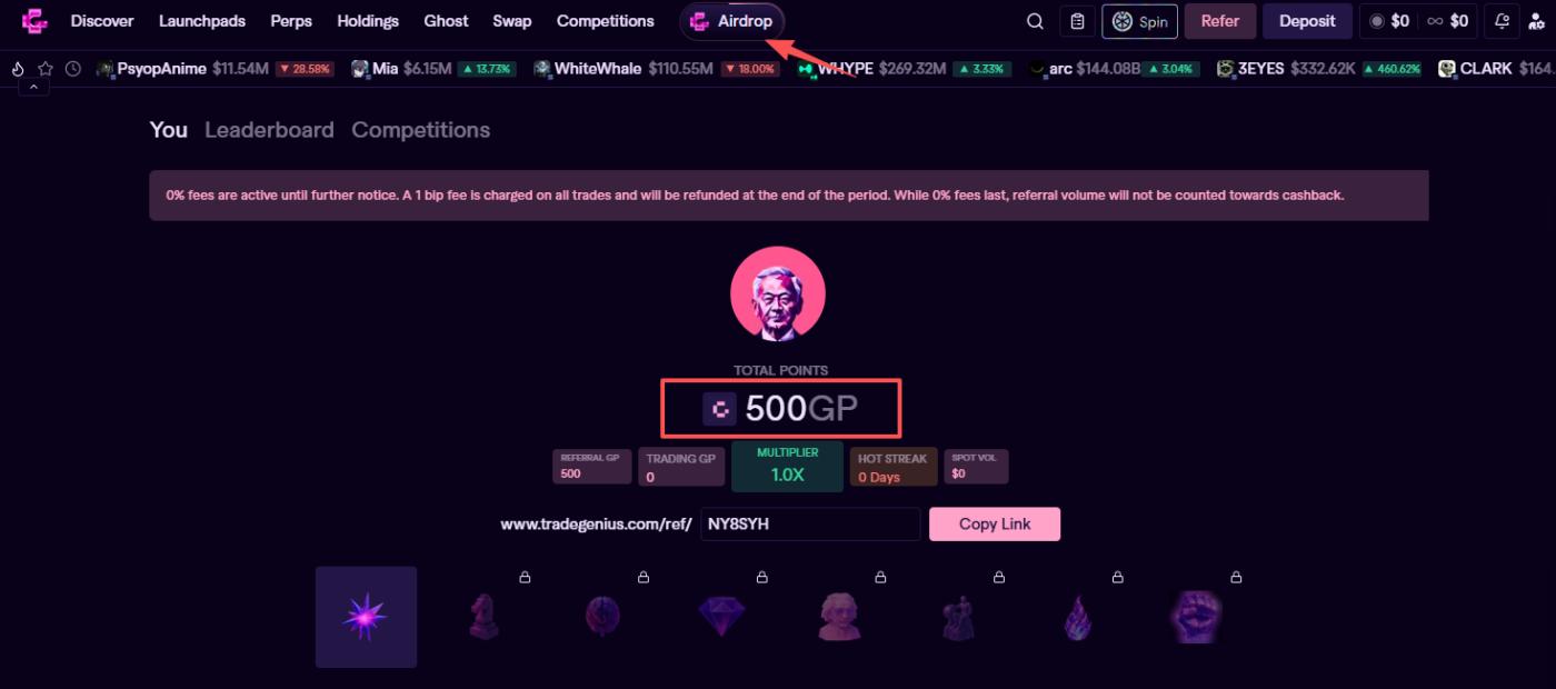 BƯỚC 2. Nhấn"Airdrop" ở trên để hiển thị điểm GP hiện tại của tài khoản và liên kết mời cá nhân.