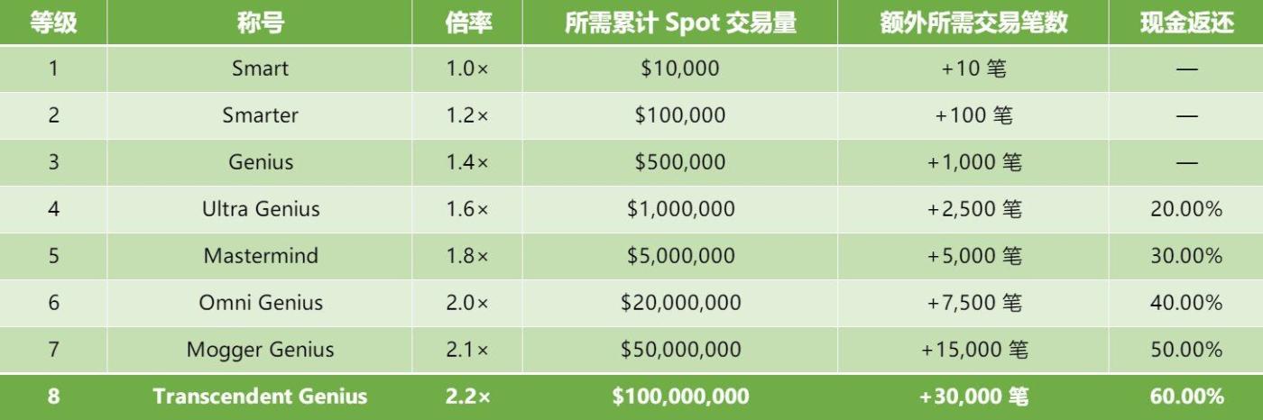 - Hệ số nhân cơ bản và hệ số nhân chuỗi thắng áp dụng cho giao dịch hợp đồng spot và hợp đồng vĩnh cửu của người dùng (điểm thưởng giới thiệu không được bao gồm).