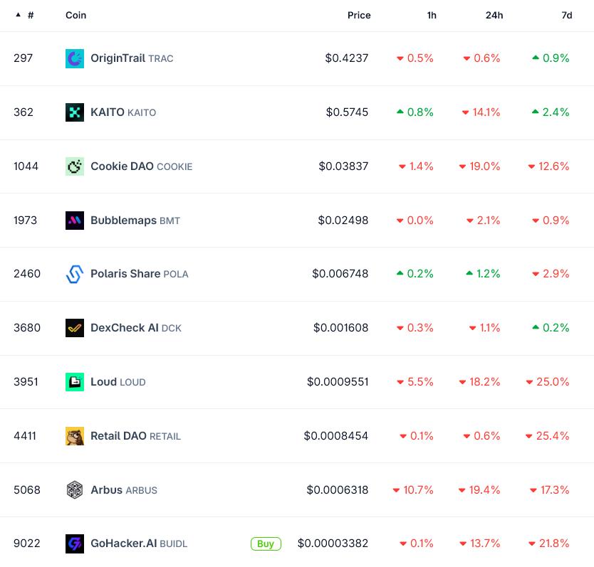 Quyết định này đã gây ra một đợt bán tháo ngay lập tức trên toàn bộ các token của InfoFi. Kaito, Cookie Các tổ chức tự trị phi tập trung (DAO), BubbledMaps, Loud, Arbus và một số token khác đã giảm mạnh chỉ trong vài giờ khi các nhà giao dịch tính đến việc mất đi động lực phân phối và tăng trưởng cốt lõi của chúng.