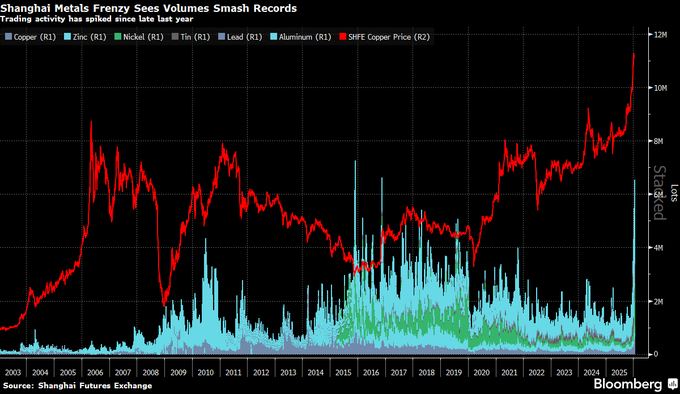 (BN) Kim loại giảm mạnh khi sàn giao dịch Trung Quốc được yêu cầu gỡ bỏ máy chủ tốc độ cao - Giá kim loại giảm vào cuối một tuần đầy biến động, khi tin tức về việc Trung Quốc siết chặt giao dịch tần suất cao đã làm giảm tâm lý thị trường sau hoạt động sôi nổi trên thị trường tương lai đại lục, đẩy giá toàn cầu tăng. - Theo những người quen thuộc với vấn đề này, các cơ quan quản lý đã ra lệnh cho các sàn giao dịch gỡ bỏ các máy chủ do các nhà giao dịch tần suất cao vận hành khỏi trung tâm dữ liệu của họ, khiến giá đồng, kẽm và nhôm đều giảm tại Thượng Hải và Sàn giao dịch Kim loại Luân Đôn. Theo Bloomberg News, khối lượng giao dịch gần đây trên SHFE đã “phá kỷ lục” (xem biểu đồ bên dưới). *Đã thêm giá Đồng Thượng Hải vào biểu đồ để hình dung các đợt tăng đột biến trước đó trong bối cảnh: