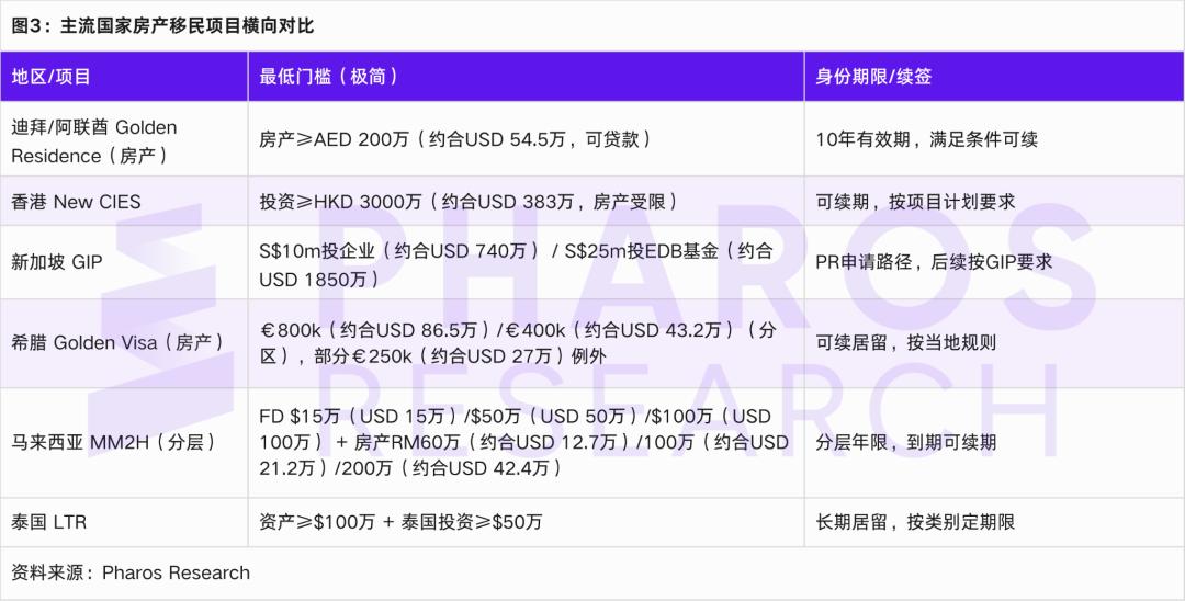 Ngược lại với Pangu, việc thể chế hóa các dự án bất động sản ở nước ngoài kết hợp với nhận dạng tương đối thấp. Lấy ví dụ về Visa Vàng của Hy Lạp, thiết kế chính sách của nó không coi bất động sản là mục tiêu đầu cơ, mà là tấm vé tuân thủ: ngưỡng đầu tư được phân cấp theo khu vực, các yêu cầu về tài sản và khu vực cụ thể được đặt ra, và các hạn chế được áp đặt đối với việc sử dụng (đặc biệt là cho thuê ngắn hạn). Các diễn giải pháp lý và thể chế công khai cho thấy ngưỡng đầu tư cho Visa Vàng của Hy Lạp ở một số khu vực đã được nâng lên 800.000 euro hoặc 400.000 euro, trong khi vẫn giữ nguyên mức 250.000 euro liên quan đến việc cải tạo/chuyển đổi mục đích sử dụng. [14][17] Đồng thời, các hạn chế cho thuê ngắn hạn được áp đặt đối với các tài sản có được thông qua Visa Vàng (ví dụ: cho thuê ngắn hạn kiểu Airbnb bị cấm), và các mô tả về các khoản phạt tiềm năng hoặc thậm chí rủi ro cấp phép đối với các vi phạm đã xuất hiện trong các diễn giải của nhiều tổ chức chuyên nghiệp. [16] Những dự án như vậy thường được đơn giản hóa trong truyền thông thị trường thành việc mua nhà để có được quyền công dân, nhưng từ góc độ kỹ thuật thể chế, nó giống một sản phẩm đóng gói gồm tài sản, sự tuân thủ, việc sử dụng và quyền: