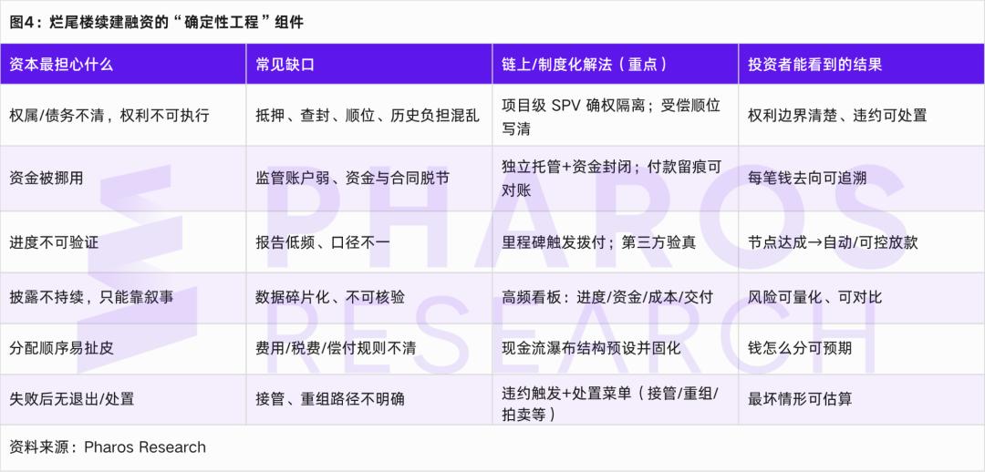 Trong bối cảnh bất động sản, tài chính Chuỗi dễ bị hiểu nhầm nhất là việc đưa tài sản lên Chuỗi. Nhưng một cách hiểu thực tế hơn là nó là một phương pháp tạo ra sự chắc chắn, tức là củng cố các liên kết quan trọng và đáng ngờ nhất trong quản trị dự án, chẳng hạn như ranh giới quyền sở hữu, thu thập quỹ, phân phối nút, công khai liên tục, thứ tự phân bổ và xử lý mặc định, thành một quy trình có hệ thống, và làm cho các hồ sơ quan trọng kiểm toán, truy xuất nguồn gốc và chịu trách nhiệm. [18][19] Để tránh khái niệm hóa, Hình 4 tương ứng trực tiếp với "điều đáng sợ nhất trong việc tài trợ cho các tòa nhà chưa hoàn thiện" với "tài chính Chuỗi nên làm gì".