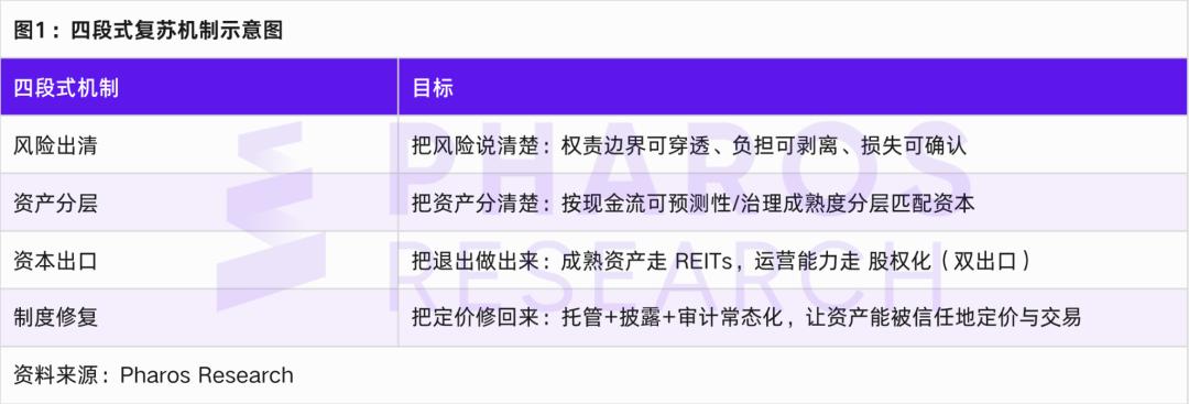 Giai đoạn thứ tư là phục hồi thể chế. Chỉ báo cốt lõi của việc phục hồi thể chế không phải là sự phục hồi của giá nhà ở, mà là sự khôi phục định giá tài sản: thị trường có thể định giá tài sản dựa trên tính minh bạch, quản trị, lưu ký và chất lượng dòng tiền, và lộ trình thoái vốn có thể dự đoán được, có thể lặp lại và được điều chỉnh. Bước này quyết định liệu sự phục hồi chỉ là sự phục hồi nhất thời hay là sự khởi đầu của một chu kỳ mới.